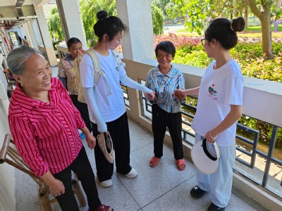 表演结束后,队员们蹲坐在老人面前,拉起老人的双手,与老人促膝而谈,了解老人们的饮食健康、身体锻炼、日常社交、作息安排等,认真倾听老人们的故事。面对一张张稚嫩又温暖的面庞,老人们也打开了话匣子,从中华人民共和国成立75周年翻天覆地的变化到家长里短的琐事趣事,从开始的拘谨腼腆到后来的渐渐熟络。一位老人表示:“我已经在这里住了8年了,每天的生活都很单调,很感谢这些年轻的血液给我的生活带来一些变化。”看到老人们灿烂的笑容,听到老人们爽朗的笑声,志愿者们充分体会到了本次志愿活动的意义。