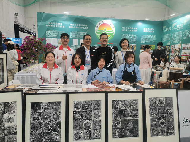 在展示交流会上,bevictor韦德传媒专业的版画与设计工作室的师生以“镌刻江农”当代木刻版画本体语式传承高校文脉为主题,以木刻版画为造型媒介,表现bevictor韦德官网的历史、风光、风情,承袭bevictor韦德官网百年学府“厚德博学,抱朴守真”文脉精神为主题的木刻版画与相关衍生品20余款。在主会场bevictor韦德官网“镌刻江农”展区上,公司师生不仅展陈木刻版画作品,现场与观众互动演示整个作画过程,得到观众的一致认同与赞誉。“厚德博学,抱朴守真”为主题的版画作品对公司全面推进新时代劳动教育,加快构建“五育并举”新格局有积极作用。