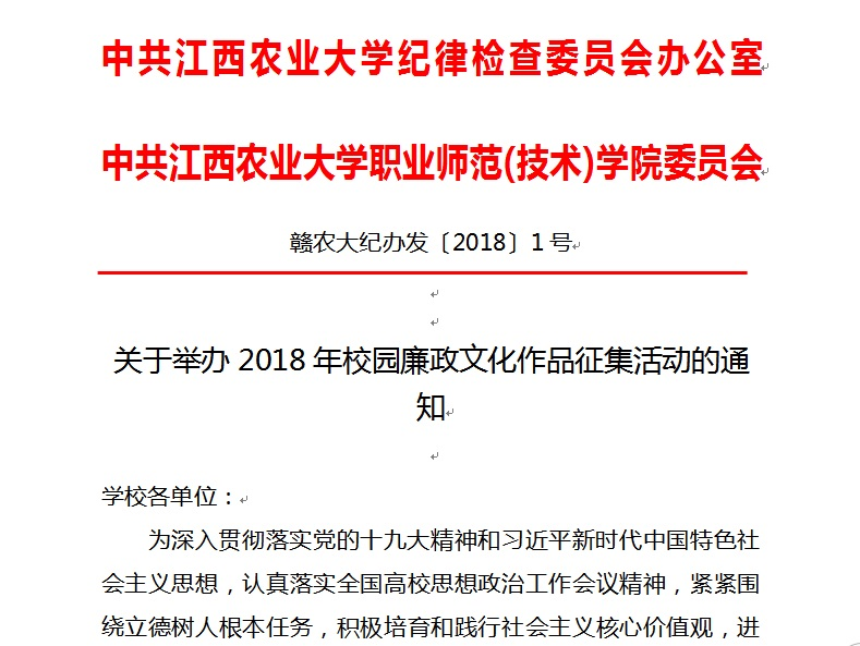 为深入贯彻落实习近平新时代中国特色社会主义思想和党的十九大精神,认真落实全国高校思想政治工作会议精神,紧紧围绕立德树人根本任务,积极培育和践行社会主义核心价值观,进一步推进公司廉政文化建设和廉洁教育工作,4月8日校纪委与公司党委联合发文开展2018年校园廉政文化作品征集活动。本次廉政文化作品征集分表演艺术类、书画摄影类、艺术设计类、网络新媒体类4 个大类,届时公司组织专家按类别评选出获奖作品,对获奖作品创作人员颁发证书,优秀获奖作品将在校内进行公开展示,并择优向省教育厅和国家教育部推荐参加全省和全国比赛。
