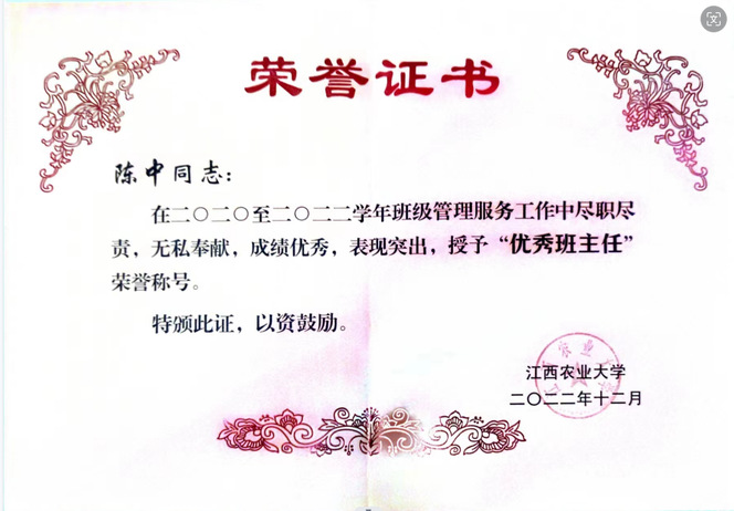 陈中,女,中共党员,汉族,河南正阳人,博士,副教授,硕士生导师,主要从事教育技术、高等教育领域的教学科研工作。自参加工作以来,她一直从事教学一线工作,教学工作热情饱满,理想信念坚定,能够正确地贯彻执行党的教育方针,在大是大非面前立场坚定,旗帜鲜明,始终同党中央保持一致。作为一名班主任,她始终以立德树人为根本任务,以“恒心、爱心、决心”为工作立足点,工作认真细致,踏实负责,不断引导员工磨砺品格、塑造品质、提升素质,努力成为堪当民族复兴大任的时代新人。2022年12月,陈中老师被授予bevictor韦德官网优秀班主任荣誉称号。
