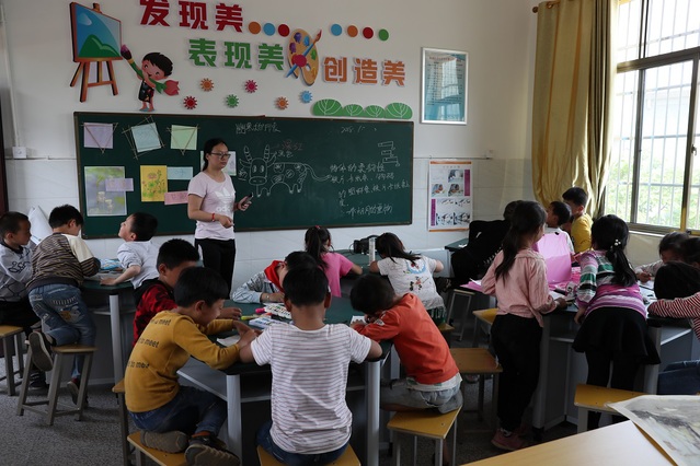 美术课上,支教老师通过传授美术知识和技能,使小员工们尝到的美术活动的乐趣。