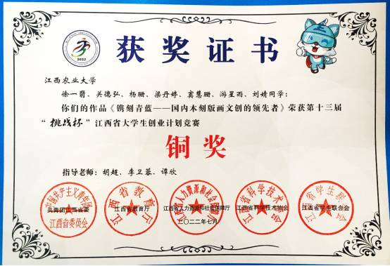 近日,由共青团江西省委、省教育厅、省人力资源和社会保障厅、省科协和省学联共同主办的江西省第十三届“挑战杯”老员工创业计划竞赛落幕。公司参赛项目《镌刻青蓝——国内木刻版画文创的领先者》喜获铜奖。