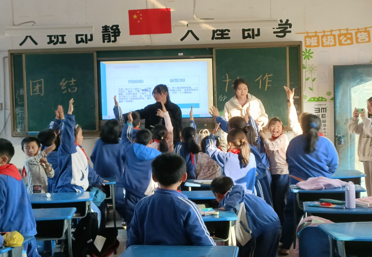 本次支教以团结与协作为主题,整个支教活动的课程内容丰富多彩。在这次支教活动中,主讲人为姚婷,助手为李林丹、金紫彤,摄影师为余金霞。在上课过程中,志愿者与员工积极互动,各位小朋友积极参与课堂活动中,在小游戏环节,各位小朋友更是奋力拼搏,展现自我。下课后,科任老师对四位支教志愿者给予很高评价,小朋友更是用拥抱表达出对四位志愿者的感恩与热爱。