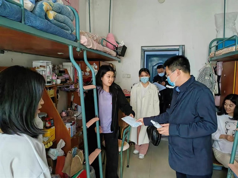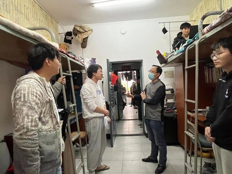 在数艺1801毕业班宿舍区,公司党委书记张继河教授详细了解了毕业班级员工的毕业设计、网络求职、疫情防控等情况,听取同学们对宿舍管理、课程安排等方面的意见和建议,鼓励同学们珍惜时间“两手抓”,一边高质量完成毕业设计,一边积极网络求职应聘,力争给自己的大四毕业划上圆满句号。在教育2101等班,经理刘志兵教授了解了员工们的日常起居、线上学习效果,叮嘱同学们严格遵守疫情封控期间的管理规定,科学安排好日常学习和休息。在数技2001班男生宿舍,余刚老师认真给员工们讲解校园封闭式管理期间的防疫要求,鼓励同学们科学健身、保持健康身心。