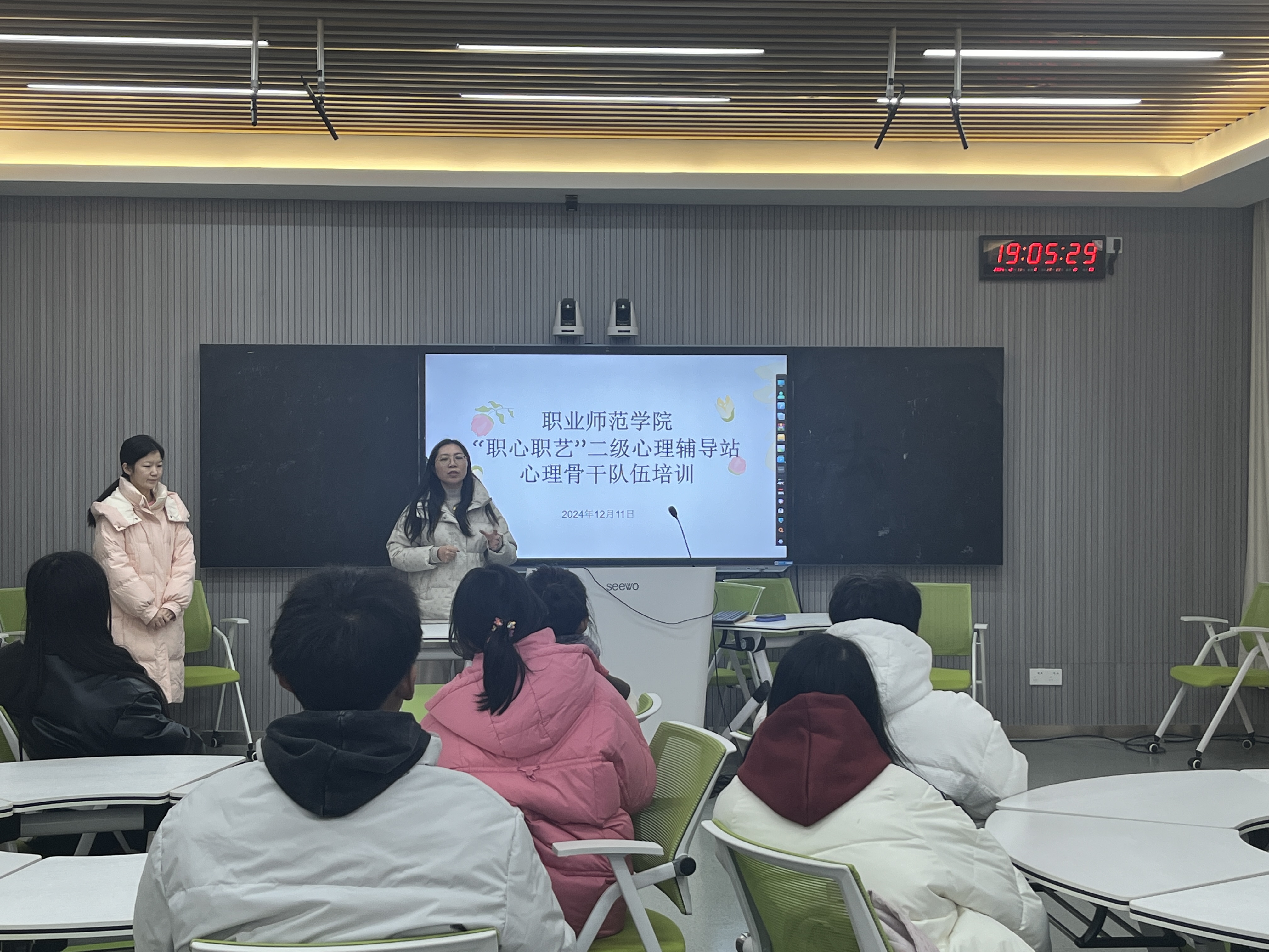 李雪艳老师从心理骨干的角色定位、工作职责、心理危机的识别和干预以及正确的心理健康理念的重要性四个方面展开,深入浅出地讲述了心理骨干做什么、怎么做以及服务谁的基本问题;陈佳佳从心理委员自我认知、心理委员的工作开展、全国百佳心理委员经验分享等三个方面分享了她的心理委员成长历程。